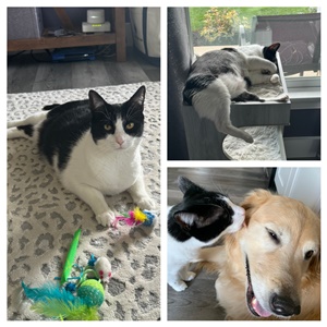 Puck came into our lives seven years ago. When he found us, he was only a few weeks old, but quickly adjusted to living with us. Our hearts were full, watching him in our dog Kenzie become best buddies. When Kenzi passed away unexpectedly 2 years ago, our hearts were broken. Thank god we had Puck. While he was an independent cat, I think he secretly loved all the extra attention he got from us. He loved to lay on his perch in the sun and his kitty treats after getting his daily hair brush. While he didn’t like to be held, he always wanted to be with us. We continue to expect to see him in all his favorite spots or between our legs when we go to bed. We miss him terribly but know that he is no longer in pain and reunited with his buddy Kenzi. We love you Puck and pray we will see you again one day.
