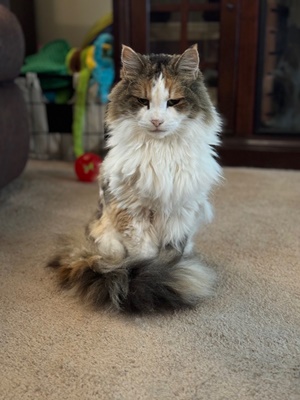 Marley was our sweet and spicy girl for the past almost four years. She came to us neglected and emaciated. It was estimated that she was likely 12 years old at the time but was likely a few years older than that. Marley loved her stuffed giraffe, car rides, Chick-fil-A grilled nuggets, kitten milk, cozy blankets, flowers, sunbeams, and cuddles on her terms. She was definitely the queen and boss over her feline brothers but loved them and us fiercely. Marley Girl, our Mar-Mar, we will miss you and are so grateful we were able to love, spoil, and take care of you for the last four years.
