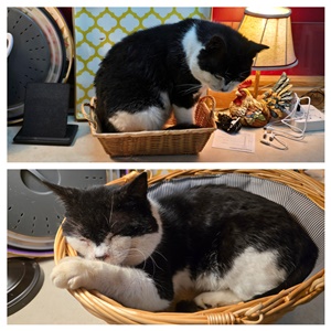 Teddy came to us as a stray and worked his way into our hearts. He loved baskets and the kitchen sink. He was always an outside cat who came in when he wanted to but would not stay. He was never our cat but we miss him nevertheless.