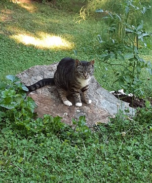 Tigeress was a sweet stray who showed up at our home with 2 kittens one day & promptly adopted us. It took her a few years to realize that she actually enjoyed human contact, but in her later years she even came to enjoy a gentle belly rub! Who would've thought?? One frigid rainy day, while still an outdoor kitty, she found & brought home a newborn kitten. (We searched for the mama & other kittens but found nothing.) We immediately found someone to bottle feed the kitten & they ended up adopting him. Today he is very happy & thriving, thanks to Tigeress. Tig was a constant presence in our lives for so many years & we grew accustomed to her vocal interactions with us. She had a favorite toy that she dragged around with her from room to room like a child with a security blanket. If she heard someone jingle its bell she would come running to quickly snatch it up. It was only right that we buried her toy with her. What a blessing to have been chosen by Tigeress. She brought us so much joy. We loved her so much & really miss her π